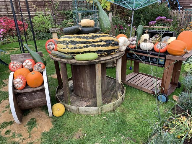Gerald memamerkan sayur dan buah yang dipanen dari kebunnya. Mejanya dipenuhi dengan labu yang ukurannya lebih besar dari bola. Foto: Twitter/geraldstratfor3