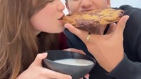 Mencelupkan kukiskan ke dalam susu saja harus dilakukan berdua. Haviza dan Harris sampai harus menahan tawa sebelum menyantapnya. Foto: Instagram/harrisvriza