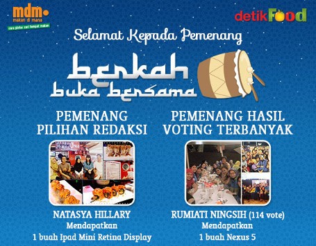 Wah, redaksi sempat bingung memilih pemenang karena foto-foto yang dikirimkan sama-sama menarik dan memenuhi syarat. Akhirnya, inilah nama-nama yang terpilih sebagai pemenang Berkah Buka Bersama: