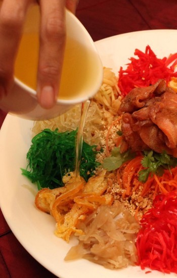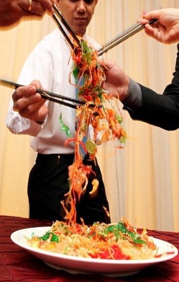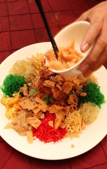 Pertama, piring berisi aneka sayuran diletakkan di atas meja sambil mengucapkan âGong Xi Fa Caiâ (selamat atas kekayaan anda), dan âWan Shi Ru Yiâ (semoga semua harapan bisa terpenuhi). Kedua, Peras air jeruk lemon di atas ikan, mengucap âDa Ji Da Liâ, semoga keluarga selalu diberi kebersamaan dan ketentraman.