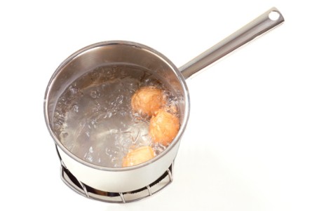 Tambahkan satu sendok teh soda kue ke dalam panci berisi telur mentah dan air dingin, lalu rebus hingga tingkat kematangan yang diinginkan.