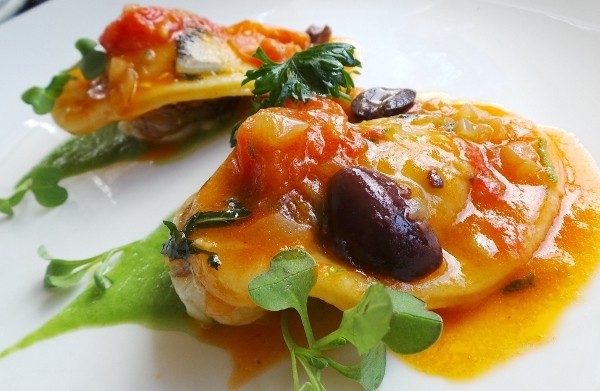 Dalam gigitan pertama terasa lembutnya kulit ravioli, serpihan daging lobsternya gurih renyah. Demikin juga saat disuap dengan scallop yang terasa manis kenyal. Sapuan saus tomat yang segar asam alami dengan olive yang sedikit asin dan leek sauce yang lembut wangi benar-benar merangsang semua bagian lidah.