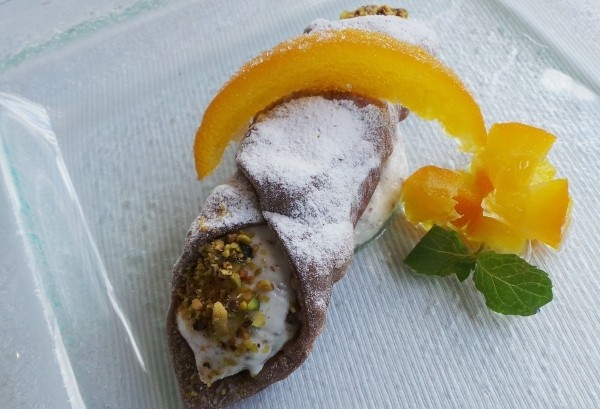 'Jangan tinggalkan Sicily tanpa Cannoli', agaknya berlaku di Rosso. Pastry berbentuk tabung inilah yang membuat Sicillia ternama. Chef Paolo menyajikan cannoli dengan isian keju ricotta, sedikit taburan pistachio cincang di kedua ujungnya. Irisan kulit jeruk navel mempercantik dessert ini.