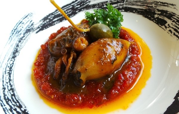 Cumi segar berikut tintanya ditampilkan chef Paolo sangat indah dalam piring cekung. Tinta cumi dioleskan di keliling piring sebagai hiasan. Dua buah cumi kecil diisi dengan cincangan chicory yang renyah.