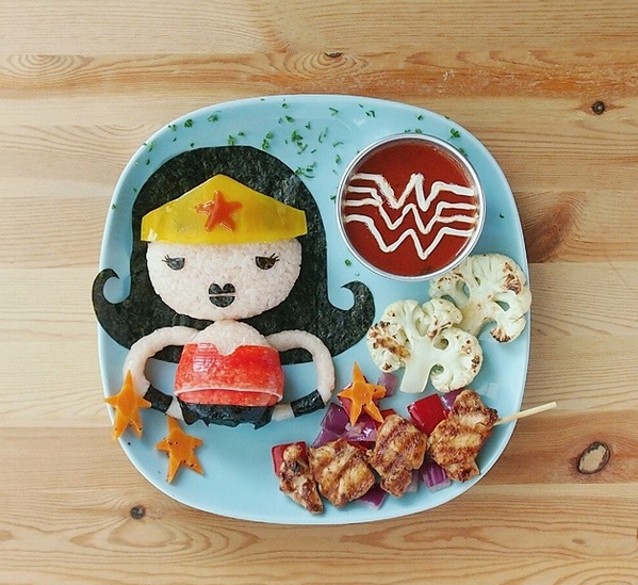 Sajian di atas piring berwarna biru ini lebih mirip dengan bento untuk bekal makan siang anak. Sajian nasi yang dibentuk menjadi wajah dan badan wonder woman, baju yang terbuat dari irisan crab, rambut hingga gelang yang terbuat dari nori dan aneka saus dan sayuran yang dibentuk menarik.Anda dapat membuat bentuk lucu ini untuk bekal makan siang si kecil dengan melihat referensi di akun instagram Leesamantha.