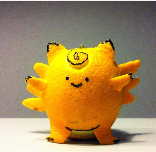 Pokemon ini dibentuk dengan membuat beberapa sayatan pada kulit jeruk dan membentuknya menjadi tangan dan juga kaki. Untuk mata dan tangan, pemilik akun instagram Withloos ini menggunakan nori yang dipotong tipis.