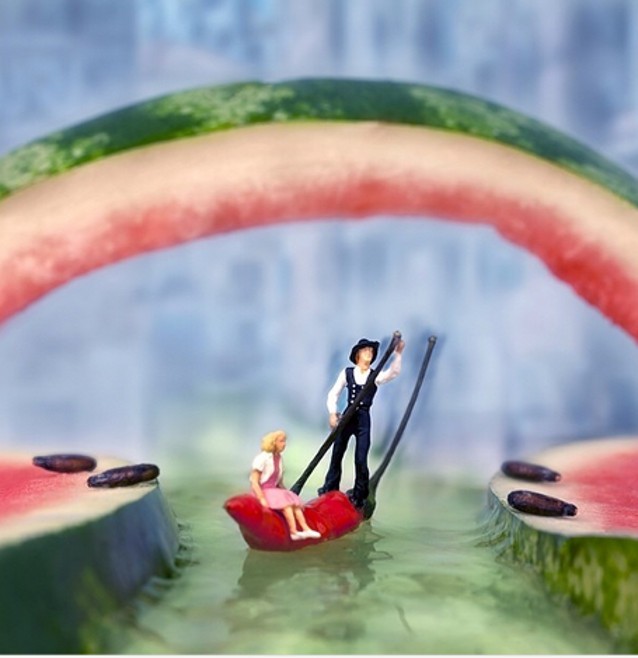 Nampaknya, gambar lucu ini terbuat dari kulit semangka dan bijinya yang dibentuk menjadi hiasan. Sedangkan cairan kental mirip puding ditaruh ditengah dan diberi cabai lengkap dengan miniatur laki-laki dan perempuan. Gambar ini diberi nama oleh Wkass dalam akun instgramnya dengan"somewhere like Venice".