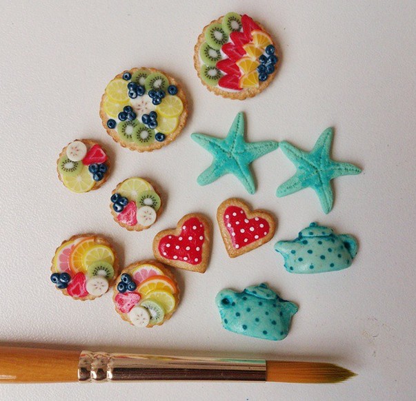 Biskuit lengkap dengan cream vanilla ini diberi hiasan buah dengan ukuran mini. Dalam akun instagram Petitplat, ia memang banyak bereksperimen dengan polymerclay sehingga semua aneka bentuk dapat ia buat dengan beranekaragam warna.
