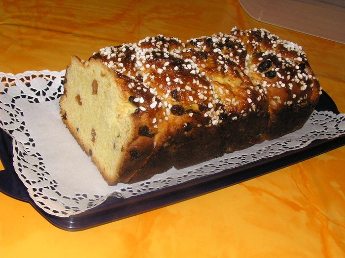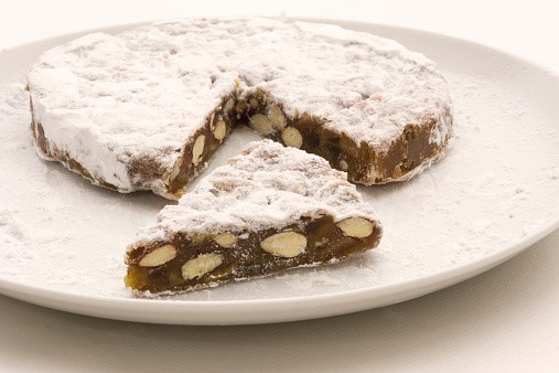 Setelah dipanggang, cake berbentuk bundar pipih ini ditaburi gula halus. Kue lalu dipotong-potong dan dinikmati bersama kopi atau dessert wine.