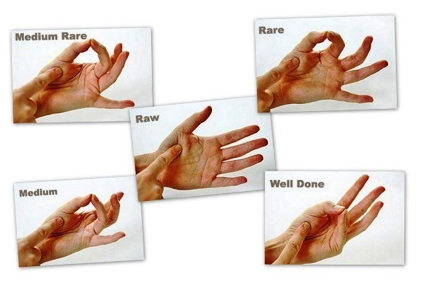 -Welldone : Sentuh jari kelingking dengan ibu jari, maka telapak tangan di bawah ibu jari akan terasa lebih keras. Inilah ciri steak yang matang sempurna atau welldone.