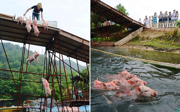 "Kami sengaja melatih babi-babi untuk terjun, menyelam dan berenang. Hal ini bisa membentuk tubuh mereka jadi lebih ramping. Daging yang mereka hasilkan juga akan lebih sehat dan padat,β kata para peternak.