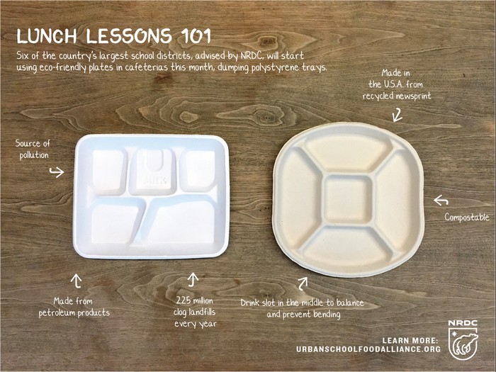 Administrator sekolah di New York City, Los Angeles, Chicago, Miame-Dade, Dallas dan Orlando pada tahun 2012 membentuk Urban School Food Alliance. Dan pada bulan Mei kemarin, lembaga ini akan mengumumkan bahwa mereka akan menanggalkan penggunaan piring polystyrene dan menggantinya dengan piring kompos untuk makan siang.