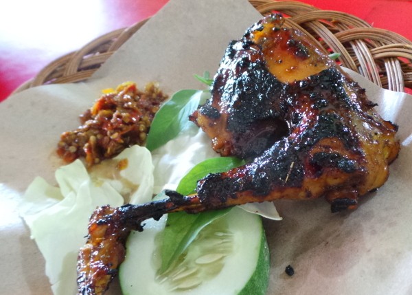 Kalau tak kuat pedas bisa diberi sedikit kecap manis. Kulit ayam yang kering kecokelatan karena olesan bumbu kecap rawit terasa gurih renyah. Daging ayamnya basah lembut. Tak berbeda dengan bebek bakarnya.