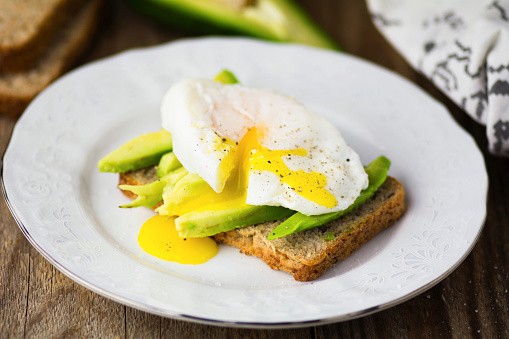 Olah telur jadi poached egg atau telur rebus. Sebaiknya telur tidak digoreng. Tempatkan olahan telur di atas roti gandum bersama irisan tomat.