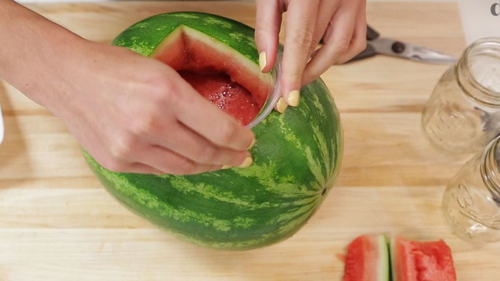 Bahan dan alat membuat cocktail semangka sangat mudah. Siapkan 1 buah semangka, soda, pisau, hand blender, gelas plastik bening, dan gelas saji untuk membuatnya. Setelah itu, ikuti langkah-langkah berikut ini.