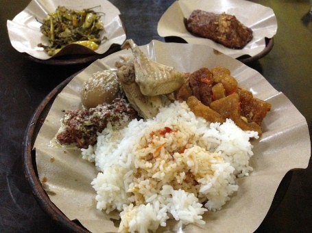 Anda juga dapat mencicip nasi dengan buntil daun singkong dan daun pepaya. Isian buntil berupa kelapa parut dan teri yang gurih enak.