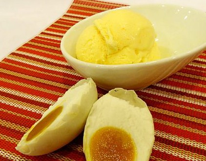 Es krim telur asin juga dibuat FATCAT Ice Cream Bar. Ada es krim batangan dari kuning telur telur asin yang dilapisi charcoal white chocolate.