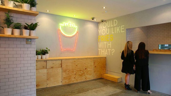Mashable (27/05) melaporkan resto pop-up tersebut bernama Fries With That yang berlokasi di bangunan bekas bioskop di Glebe. Resto ini buka 3 hari sejak Jumat hingga Minggu. Uniknya, tidak ada logo huruf M berwarna kuning yang jadi ciri khas McD di sini.