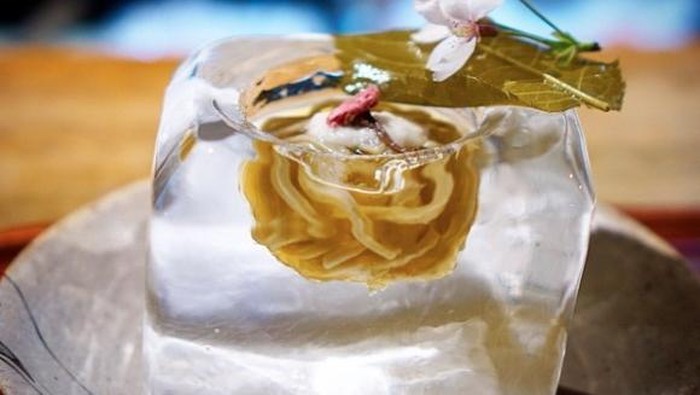 Tempura Matsu di Kyoto jadi perbincangan hangat di media sosial Jepang. Tak lain karena restoran di dekat sungai Arashiyama ini menyajikan menu unik berupa sajian udon yang bervariasi dari musim ke musim. Uniknya lagi, udon justru ditempatkan dalam mangkuk es batu besar.