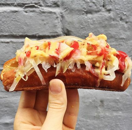 Metro (3/4) mengabarkan roti hot dog berupa brioche. Isiannya es krim dengan bentuk dan rasa sosis. Tak lupa topping berupa 'mustard' madu, 'saus tomat' raspberry, dan 'acar kubis' berupa manisan.