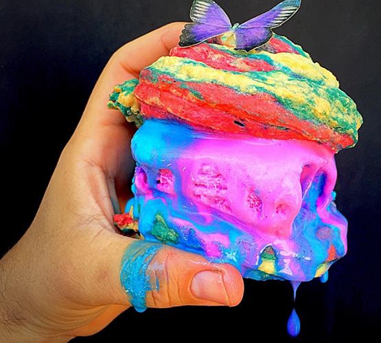 Es krim gulali atau cotton candy berwarna pink dan biru muda jadi isian sandwich. Sentuhan akhir berupa topping glitter dan kupu-kupu yang bisa dikonsumsi untuk menambah daya tarik.