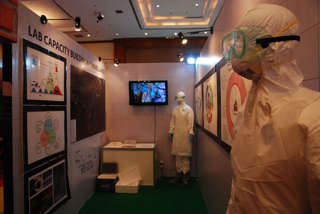 Sementara di Area Laboratorium dan Pengawasan ada penjelasan seputar kegiatan pemerintah Indonesia dan FAO dalam memonitor sirkulasi virus avian influenza di Indonesia. Serta usaha meningkatkan kapasitas perugas kesehatan hewan di lapangan yang jadi mitra para peternakan.