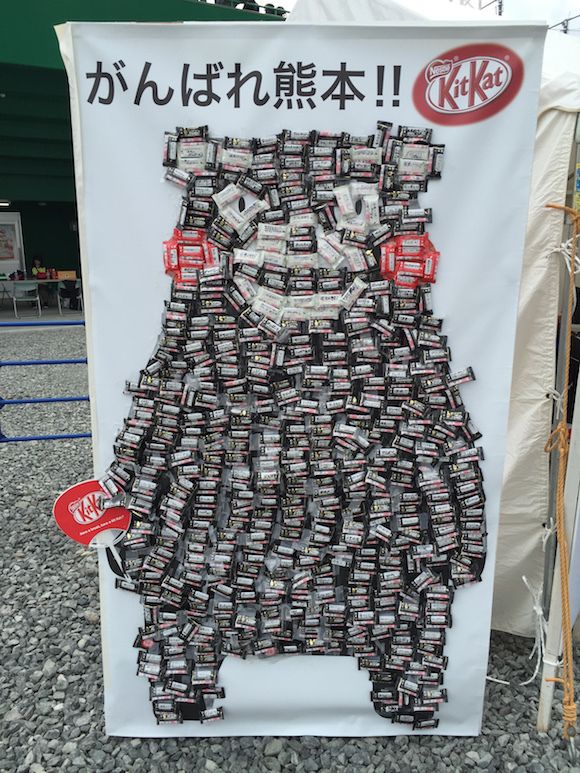 Dukungan Kit Kat tercermin dari penggunaan teh hijau yang diproduksi dan diolah di wilayah Kumamoto. Bagian belakang kemasan Kit Kat juga bisa ditulis. Memungkinkan orang lain menuliskan pesan semangat untuk penduduk Kumamoto lewat Kit Kat.