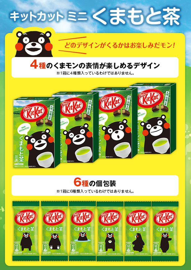 Seperti dikutip dari Rocket News 24 (27/8), Nestlé Jepang mengatakan Kit Kat Teh Kumamoto ini ditawarkan dalam periode terbatas. Kemasannya unik karena menyertakan sosok Kumamon yang imut. Berupa beruang hitam berpipi merah yang menjadi simbol wilayah Kumamoto.