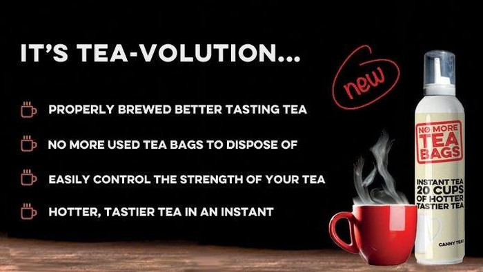 Pengguna hanya perlu menyemprotkan teh aerosol ini ke dalam gelas. Lalu tambahkan air panas dan gula atau susu sesuai selera. Teh enak dengan racikan pas pun siap dinikmati. Dalam situs resminya, No More Tea Bags mengklaim mampu atasi masalah yang umum ditemui pencinta teh. Yaitu repotnya menyingkirkan kantung teh celup basah dan mendapati teh diseduh terlalu lama (over brewed).