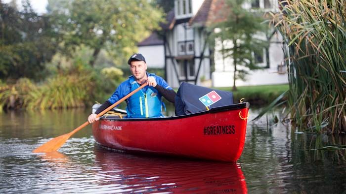 Pizza bisa dinikmati di mana saja, termasuk daerah yang dilewati sungai. Salah satu restoran Domino's kini membuka layanan pengiriman bagi konsumen yang tinggal disepanjang River Loose, Maidstone, Kent.