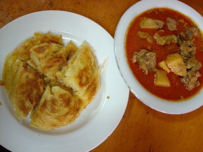 Roti cane atau roti canai berbentuk pipih yang dipanggang dengan sedikit mentega punya tekstur lembut renyah. Untuk varian rasa gurih, biasanya roti cane dipadukan dengan kuah kair polos ataupun kuah kari dengan isian potongan daging kambing.