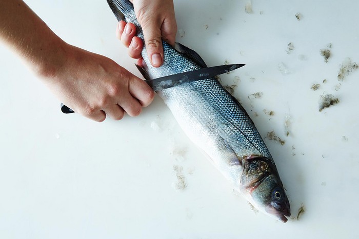 Pisau biasa boleh digunakan. Bersihkan dari bagian dekat ekor, kemudian dekat insang dekat sirip kecil. Selanjutnya bersihkan bagian badannya. Lakukan semua mengarah dari ekor ke kepala. Terakhir lap dengan kain basah dari kepala ke ekor.