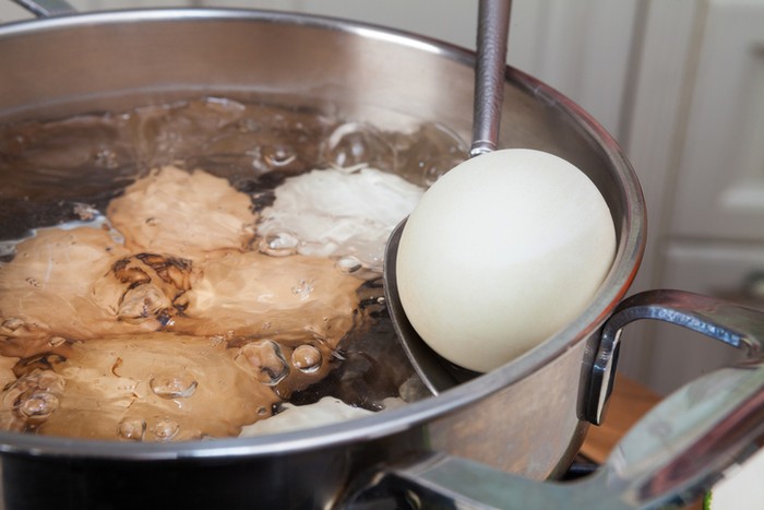 Rebus telur yang masih bercangkang selama 10 detik. Setelah itu diamkan air mendidih hingga suhunya tidak terlalu panas dan masukkan telur masak hingga bagian putihnya melapisi kuning dengan sempurna.