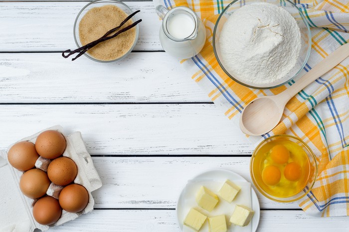 Siapkan 350 gr telur utuh (7 butir), 50 gr kuning telur (3 butir), 160 gr gula pasir, 12 gr stabilizer, 130 gr tepung terigu protein sedang, 10 gr tepung maizena dan 125 gr margarin cair.