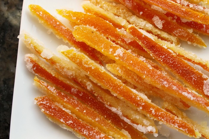 Bukan hanya untuk tepung atau kompos tetapi juga manisan. Caranya, potong kulit jeruk menjadi lembaran tipis. Rebus dalam larutan simple syrup. Gulingkan dalam gula perasa sebelum didinginkan.
