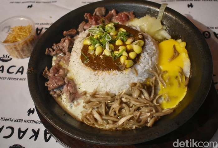 Disajikan dalam hot plate, nasi putih dengan potongan daging, jamur, bawang bombay dan telur. Makin enak dicampur dengan bumbu rendang dan juga kari sedap. Nyam!
