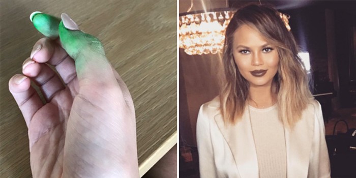Tak ayal jari tangan Chrissy berwarna hijau terang. Parahnya, warna ini tak bisa hilang meski Chrissy sudah mencucinya dengan sabun dan air. Khawatir dengan penampilannya di Grammy Awards, Chrissy langsung berkicau di Twitter untuk menanyakan solusi masalahnya ini.