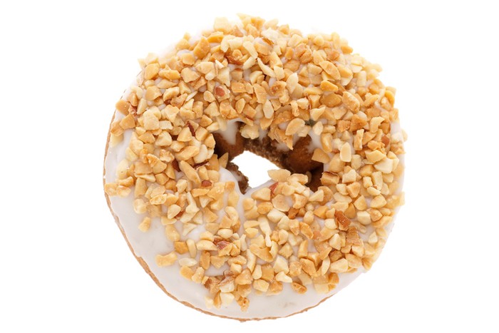 Kacang tanah paling sering dijadikan topping donat. Biasanya remahan kacang gurih ini dipadukan dengan lapisan cokelat sehingga ada semburat rasa manis enak. Selain kacang tanah, donat bertopping kacang almond kini juga populer.