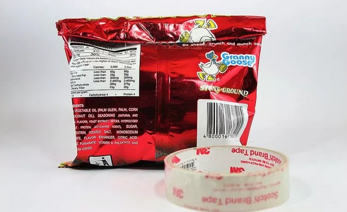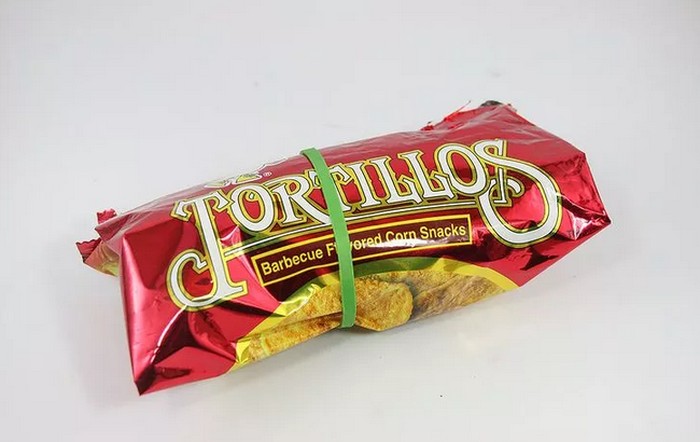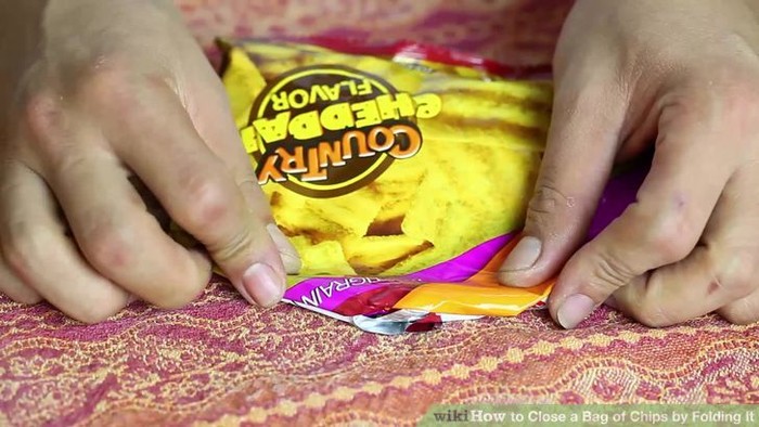 Tahap pertama tetap keluarkan udara. Kemudian lipat bagian atas menggulung sampai tepat diatas keripik sisa, beri sedikit jeda. Dan lipat kedua tepi kedalam dan masukkan ke celah gulungan sambil melipatnya ke arah sebaliknya serta ke arah bawah.