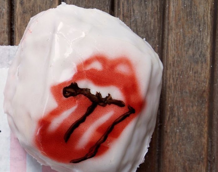 Donat Rolling Stones tampak seperti sebuah karya seni. Donat tak berlubang di tengah diidi selai raspberry dengan lapisan gula vanilla bergambar logo ikonik bibir merah dengan lidah menjuntai khas Rolling Stones.