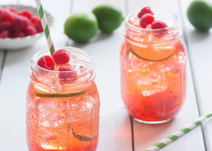 Tambahkan jus apel dan air jeruk lemon. Sajikan bersama dengan tambahan buah leci, daun mint dan juga es batu.