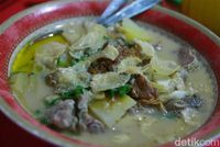 Aroma semerbak gurih sudah tercium dari luar warung tenda. Racikan kuah berwarna putih dengan paduan rempah dan minyak samin ini sangatlah enak. Kuahnya yang hangat dipadu dengan potongan daging kaki sapi hingga kikil. Rasanya empuk dan kenyal. Semakin sedap ditambah dengan potongan tomat, kentang dan juga emping renyah. Hmm, enak!