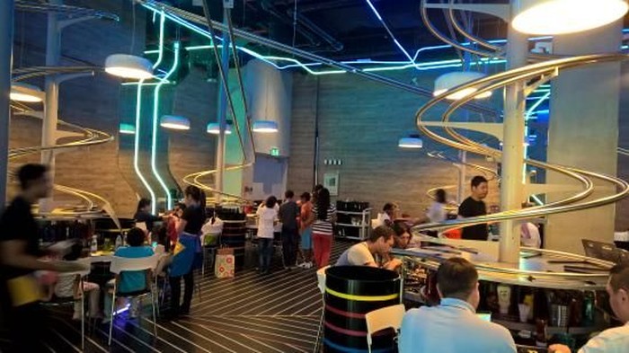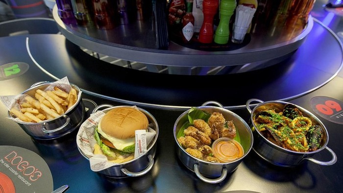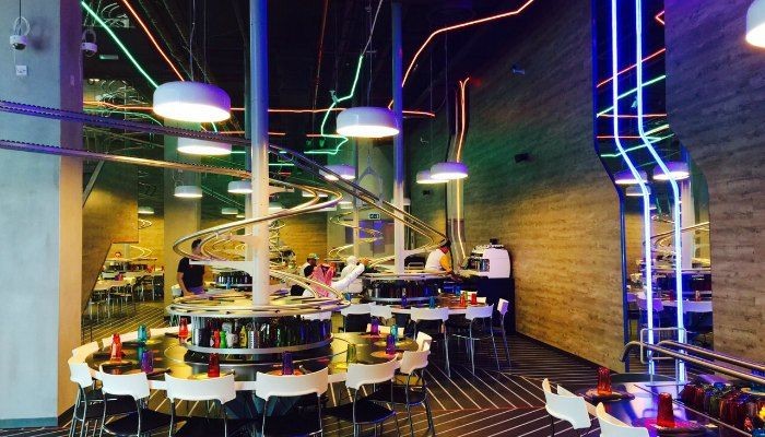 Di dalam restoran ini ada roller coaster yang bergerak secara spiral dan bergerak secara berlawanan. Roller coaster paling besar ada di tengah restoran.