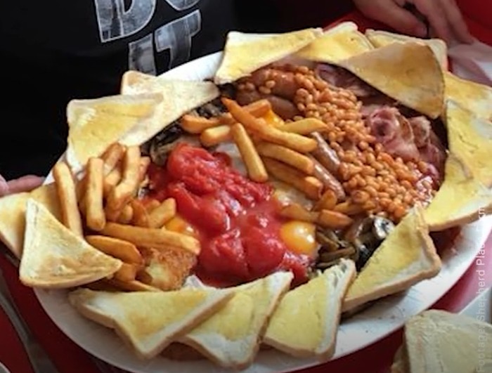 Makanan dengan ukuran besar lagi-lagi kembali menarik perhatian. Sekarang giliran English Breakfast yang dibuat dengan ukuran yang jumbo. English Breakfast merupakan menu sarapan orang Inggris yang terbilang komplet dan sudah menjadi bagian hidup orang Inggris.