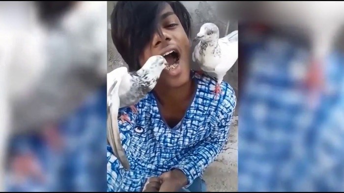 burung merpati bahkan sampai memanjat bahu pria itu, agar lebih puas menyantap butiran gandum dari dalam mulut pria itu. Bahkan kedua burung merpati itu terlihat akrab, berbagi butiran gandum dari dalam mulut.