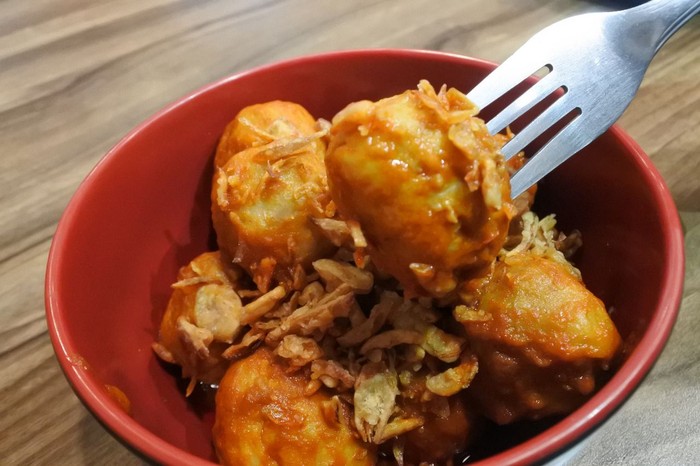 Semua pentol disajikan dalam kuah cabe rawit berlumur sambal kuning kemerahan pekat yang menyengat. Rasa gurih dan sedap dari pentol dan cabe rawitnya ini bikin nagih. Pilihan menu pentolnya juga cukup banyak.