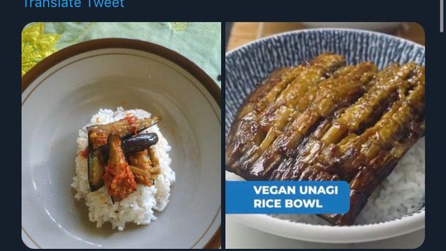 "Nasi putih terong penyet Rp 9.000 VS Vegan unagi rice bowl IDR 69K," tulis sang admin, lengkap dengan unggahan dua foto yang satu menampilkan nasi dengan terong goreng, lengkap sambal penyet di atasnya yang sederhana.