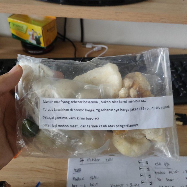 "Mohon maaf yang sebesar-besarnya, bukan niat kami menipu ka . tapi ada kesalahan di promo harga. Yang seharusnya harga jaket Rp 135 ribu. Jadi 1 ribu rupiah sebagai gantinya kami kirim baso aci. Sekali lagi mohon maaf dan terima kasih atas perhatiannya," tulis pemilik olshop pada kemasan baso aci.