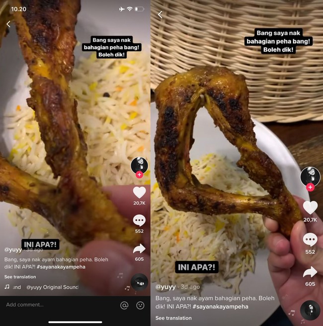 "Bang, saya ingin belia ayam goreng bagian paha. Kata penjualnya boleh, lah ini apa?" tulis Ila di keterangan videonya.
