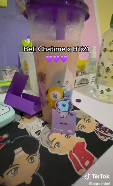 Seperti ARMY dengan akun TikTok @parkxhimi, ia membeli segelas Chatime x BT21 dengan varian Purple Star Milk Tea. Tak ketinggalan memamerkan karakter BT21 magnet yang ia dapatkan.